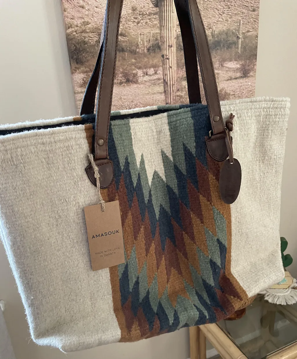 The Equinox pattern features a Zapotec lightning design in shades of Persian orange, light teal, deep slate blue, and rust, on a backdrop of natural undyed cream. This versatile tote bag features the modern silhouette with two leather straps. The Equinox Tote is just the right size to become your everyday bag. Run your errands, go for a night out, or just pack a good book and a flask of tea.